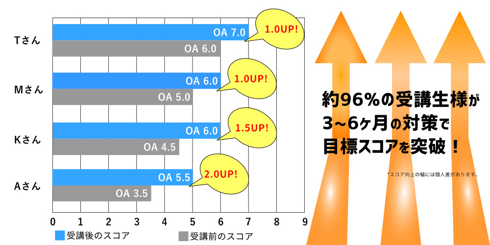 IELTS未受験、現スコアがOA4.5以下で目標スコアがOA5.0~6.0の方が対象