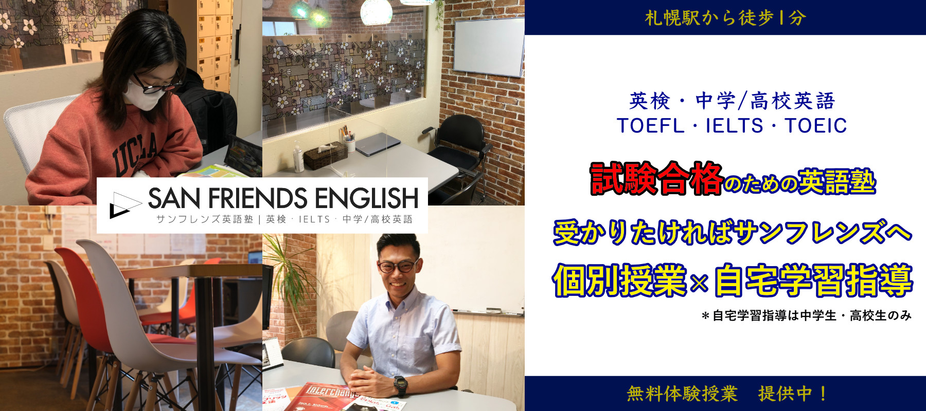 サンフレンズイングリッシュは、英検、IELTS、TOEIC、TOEFLといった民間の英語検定試験の対策から高校英語や中学英語の授業(定期テスト対策や受験対策含む)まで提供する、札幌駅から徒歩1分の場所にある「個別指導スタイル英語塾」です。2016年の開校から、これまで1,000名以上の英語学習を支えて参りました。